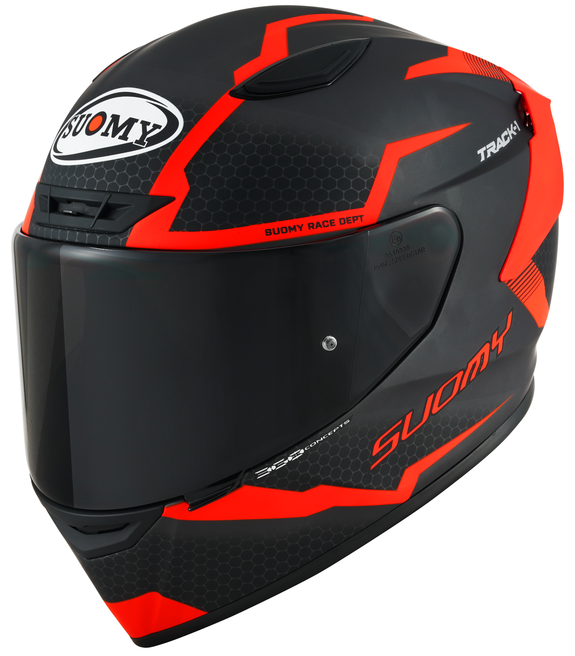 TRACK-1 este casca integrală de nouă generație de la Suomy, fabricată din compozit TRICARBOCO (Kevlar/Carbon/Fibră de sticlă), caracterizată prin forme dinamice și eficiente, proiectată și dezvoltată în tunelul aerodinamic pentru a oferi cea mai bună performanță și echilibru între utilizarea pe stradă și pe pistă.